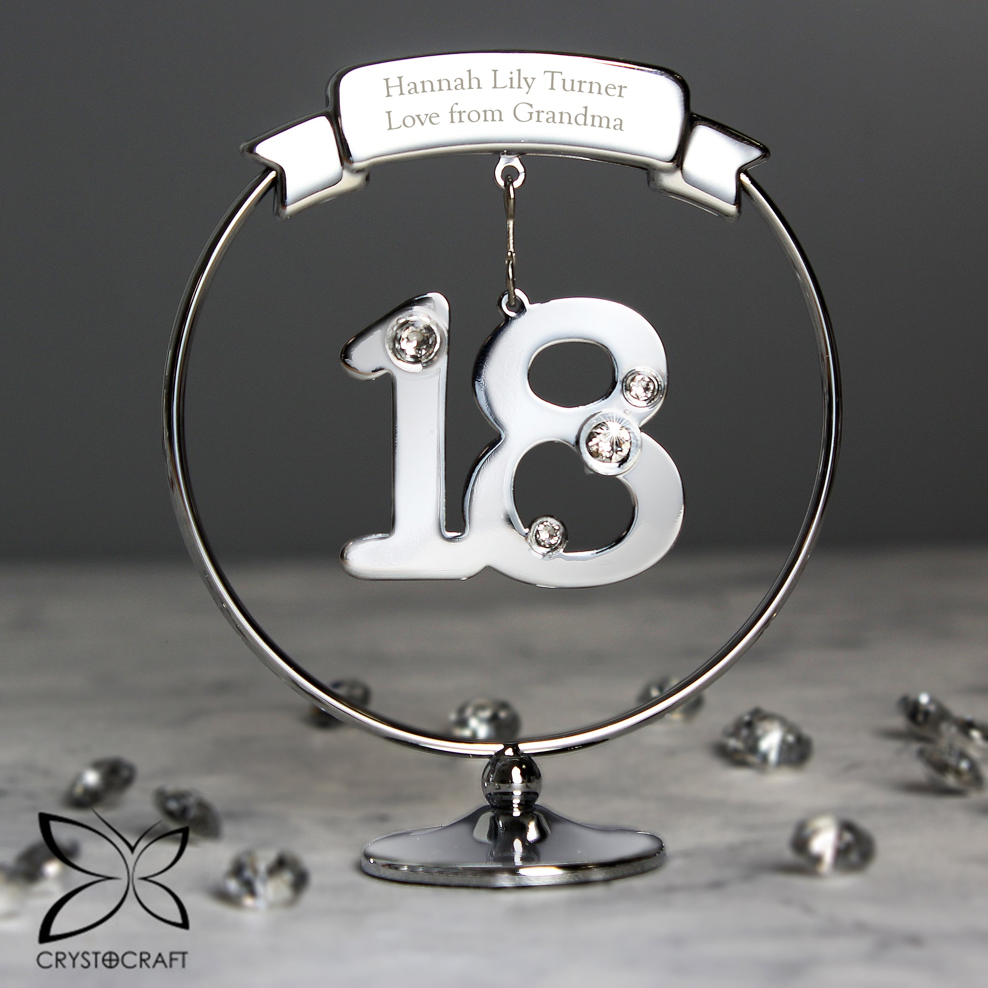 Mark their 18th Birthday with this elegant Crystocraft ornament. Dangling from a personalised round silver stand is a crystal clad 18 piece. This will catch the light and bring a smile to the recipients face.