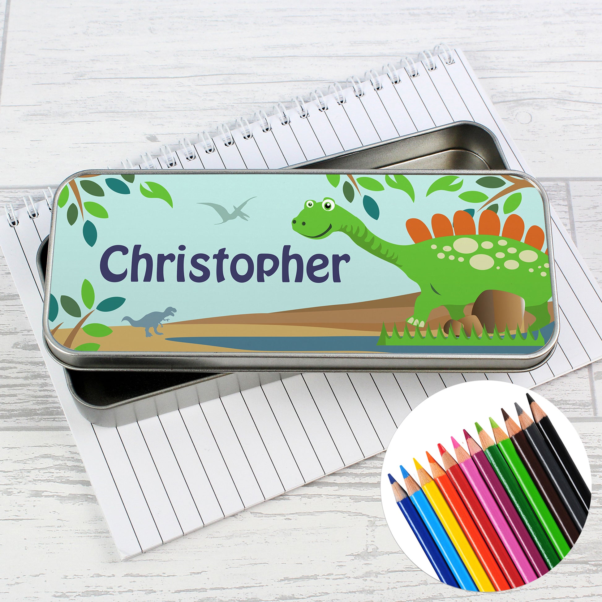 Personalised Dinosaur Pencil Tin with Pencil Crayons