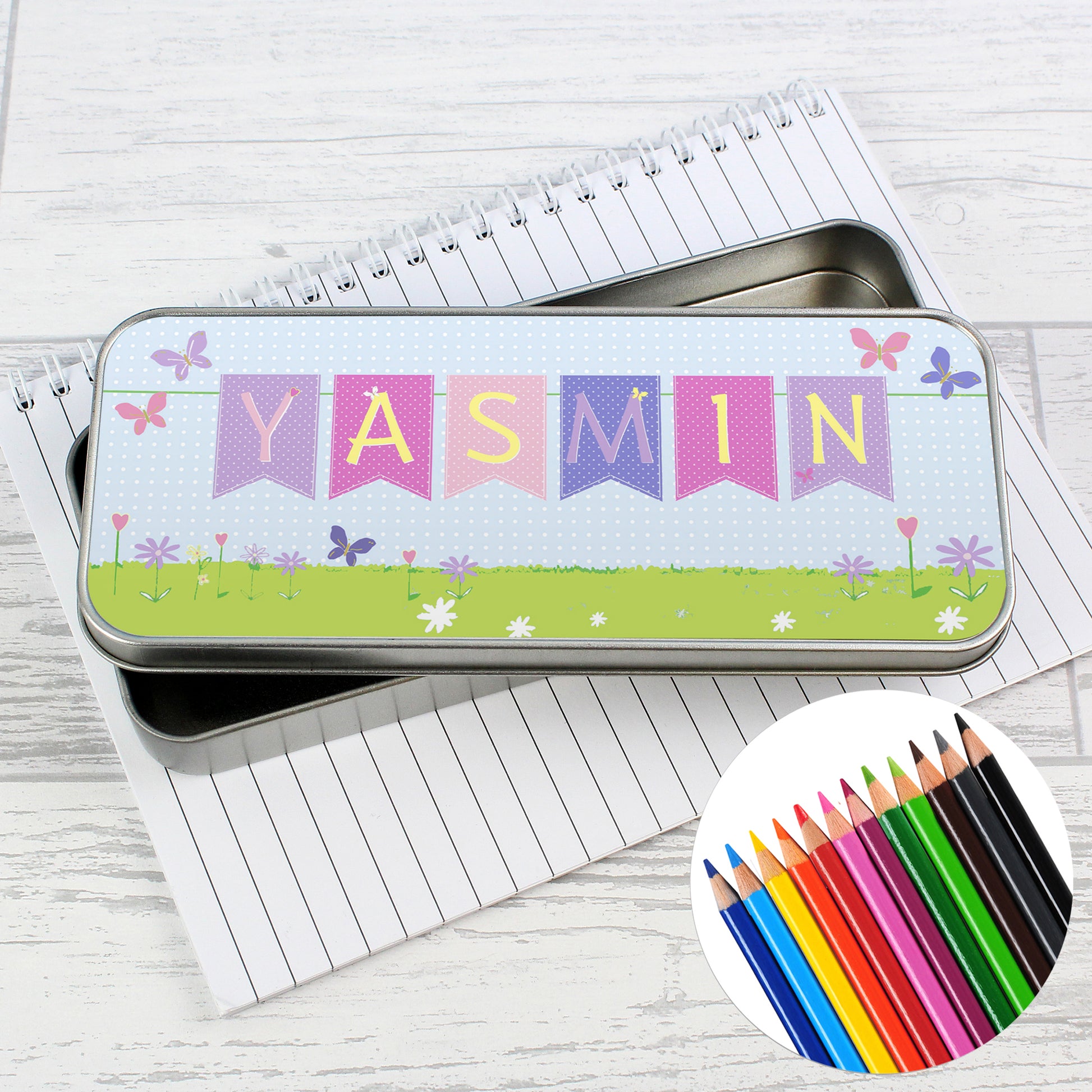 Personalised Garden Bunting Pencil Tin with Pencil Crayons
