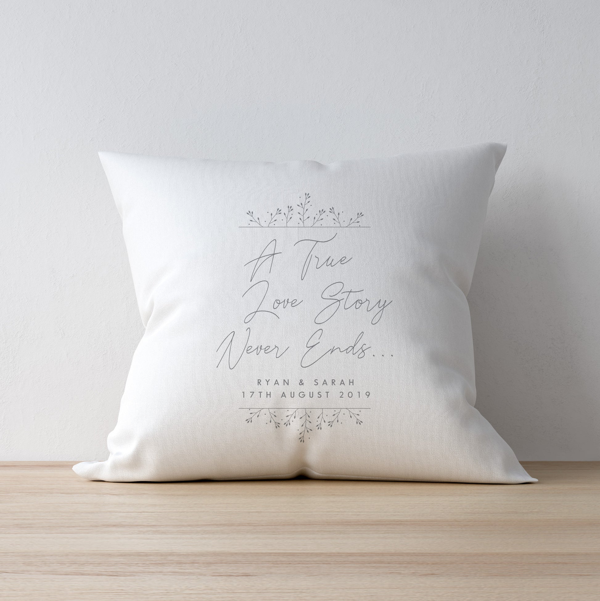 The beautiful phrase "A True Love Story Never Ends" stands proud in the centre of the cushion and your unique message is printed below.