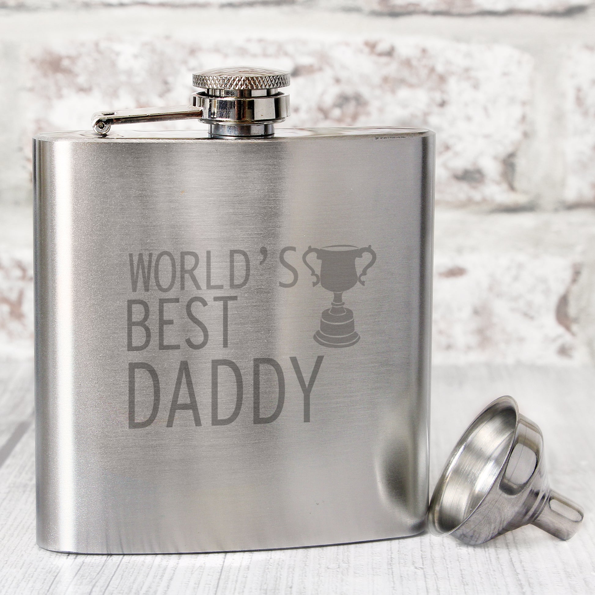 This 6 oz. stainless steel Hip Flask has the wording 'Word's Best Daddy' featuring a trophy motif as standard.